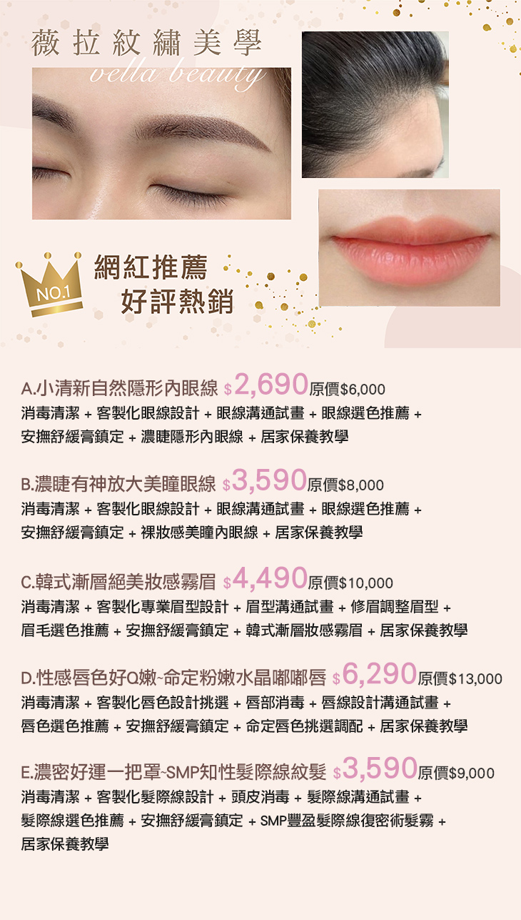 拯救無眉道人,不用再為眉毛畫不對稱困擾了!薇拉紋繡師專業的眉型設計,運用五點黃金定位法,依據你臉型的黃金比例,找出最適合你的眉型,獨特的上色手法,不適感低且不死板,一做完就非常的自然,不用擔心會有蠟筆小新的窘境,參加聚餐約會都沒有問題!