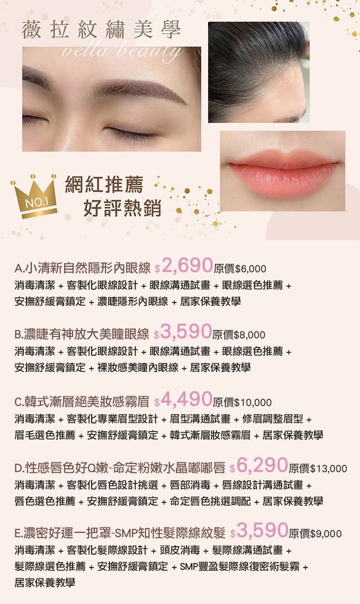 拯救無眉道人,不用再為眉毛畫不對稱困擾了!薇拉紋繡師專業的眉型設計,運用五點黃金定位法,依據你臉型的黃金比例,找出最適合你的眉型,獨特的上色手法,不適感低且不死板,一做完就非常的自然,不用擔心會有蠟筆小新的窘境,參加聚餐約會都沒有問題!