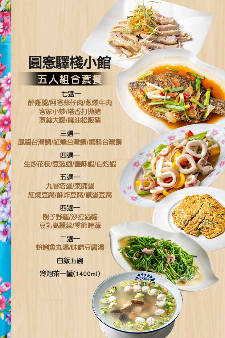 〈醉雞腿/阿爸蒜仔肉/蔥爆牛肉/客家小炒/塔香打拋豬/蔥絲大腸/麻油松阪豬 七選一 + 鳳醬台灣鯛/紅燒台灣鯛/糖醋台灣鯛 三選一 + 生炒花枝/豆豉蚵/鹽酥蝦/白灼蝦 四選一 + 九層塔蛋/菜脯蛋/紅燒豆腐/酥炸豆腐/鹹蛋豆腐 五選一 + 樹子野蓮/沙拉過貓/豆乳高麗菜/季節時蔬 四選一 + 蛤蜊魚丸湯/味噌豆腐湯 二選一 + 白飯五碗 + 冷泡茶一罐(1400ml)〉
