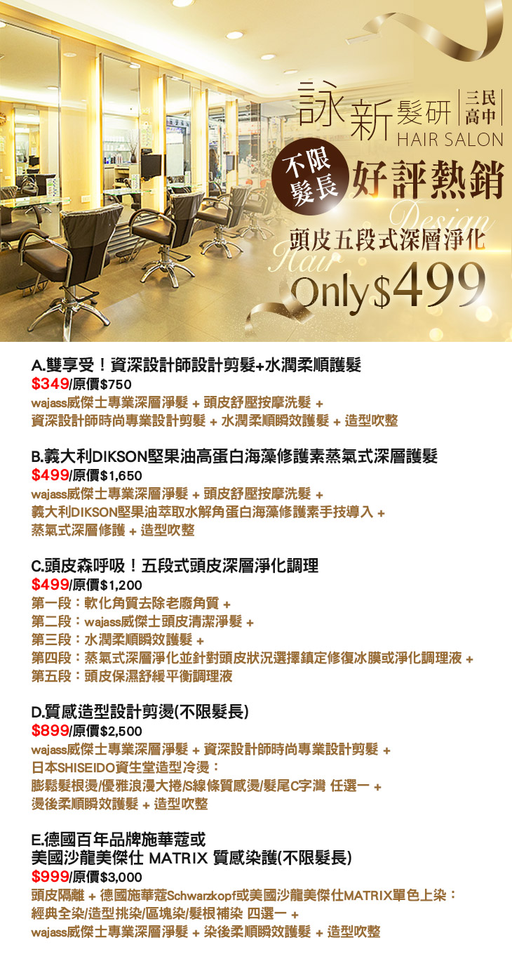 A.雙享受!資深設計師設計剪髮+水潤柔順護髮 / B.義大利DIKSON堅果油高蛋白海藻修護素蒸氣式深層護髮 / C.頭皮森呼吸!五段式頭皮深層淨化調理 / D.質感造型設計剪燙(不限髮長) / E.德國百年品牌施華蔻或美國沙龍美傑仕 MATRIX 質感染護(不限髮長)