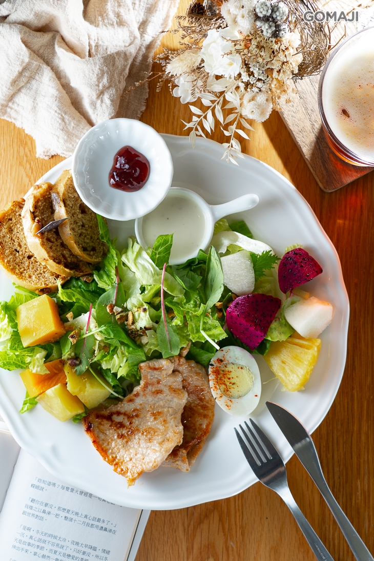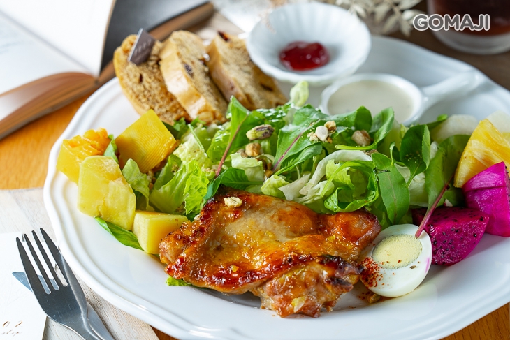主廚用料可真是毫不手軟,鋪上各式新鮮生菜及水果,連配色都很講究。主角-橙香烤雞腿的表現可圈可點,肉質鮮嫩多汁,還有細緻的香橙風味點綴,吃多了也不膩口,一旁還有每日精選的麵包切片,吃完這盤真的好滿足!