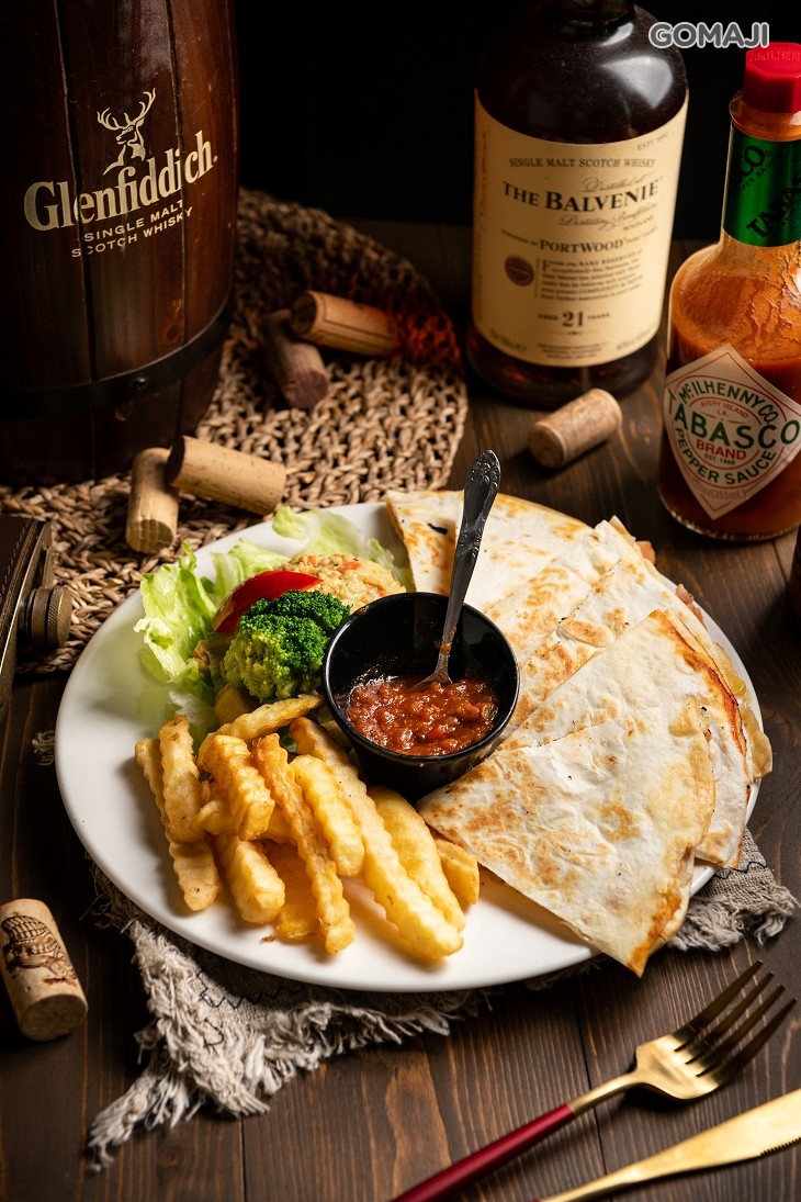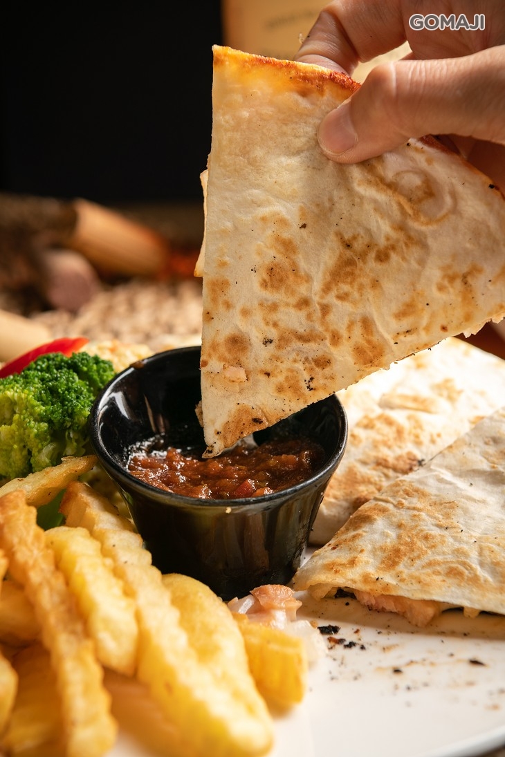 將傳統墨西哥餅皮夾入煙醺雞肉、洋蔥、玉米及莫扎瑞拉起司,以小火慢煎製作,搭配微辣的莎莎醬,一口咬下酥脆的餅皮,爆漿般的起司瞬間流出,是來店客人聚餐、配酒必點的餐點之一!