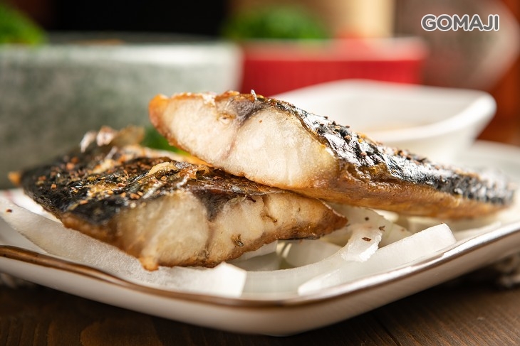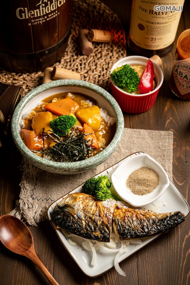 嚴選新鮮鯖魚,以鹽烤的料理方式呈現魚肉美味,魚皮微微焦黃的模樣,在日光燈的照耀下,亮眼迷人,搭配主廚特製的咖哩飯,米粒軟Q,醬汁香濃,與魚肉一口配著一口相襯品嚐,創意組合,美味加分。