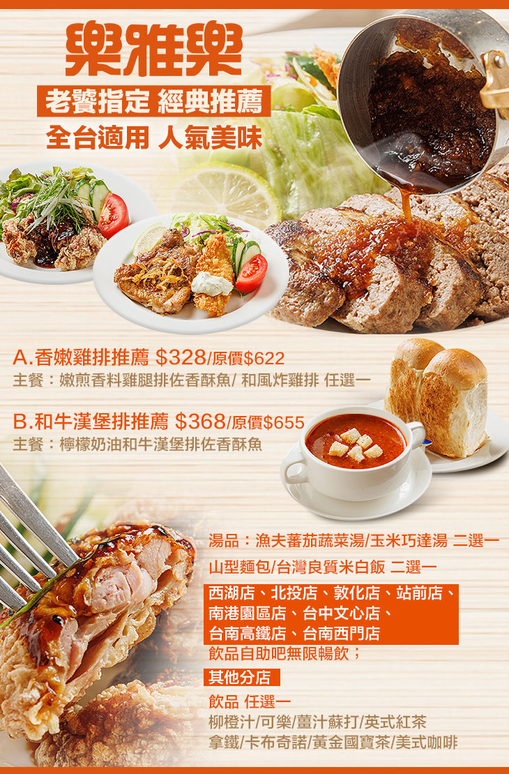 源自日本連鎖家庭餐廳【樂雅樂】,提供以日式精緻手法的創意西餐料理。包含牛排、和牛漢堡排為主、各國經典料理、和風御膳、咖哩、沙拉以及冰品、甜點,還有專門為小朋友設計的兒童菜單,讓顧客充分體驗和風洋食的好滋味。