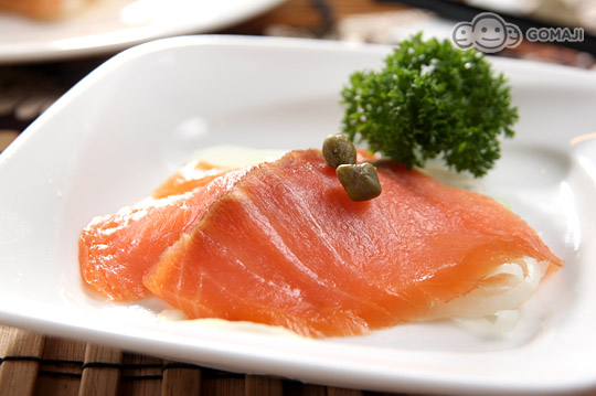光滑晶亮的鮭魚片,粉橘的色澤相當漂亮,淡淡的煙燻滋味襯托了鮭魚的滑嫩口感,令人回味無窮。