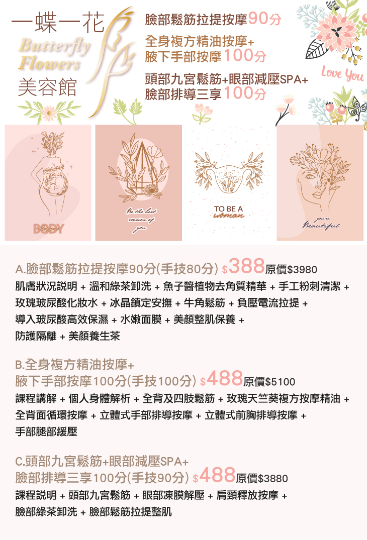 A.臉部鬆筋拉提按摩90分(手技80分) / B.全身複方精油按摩+腋下手部按摩100分(手技100分) / C.頭部九宮鬆筋+眼部減壓SPA+臉部排導三享100分(手技90分)