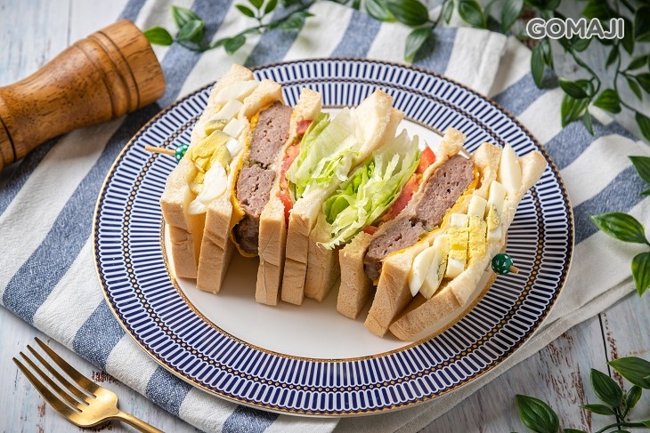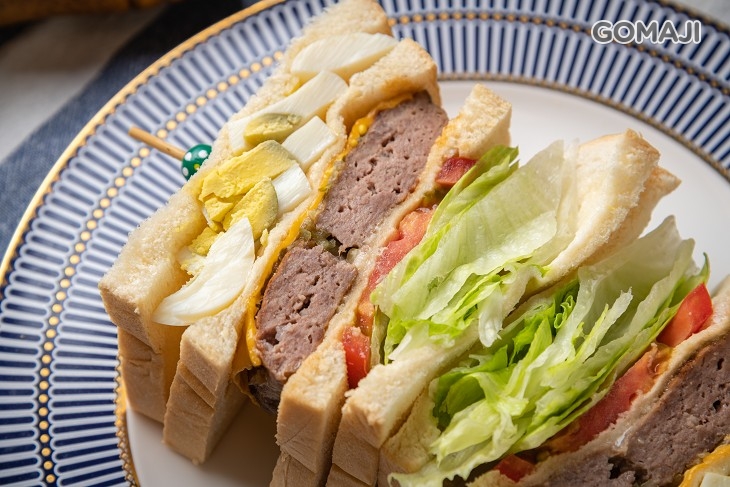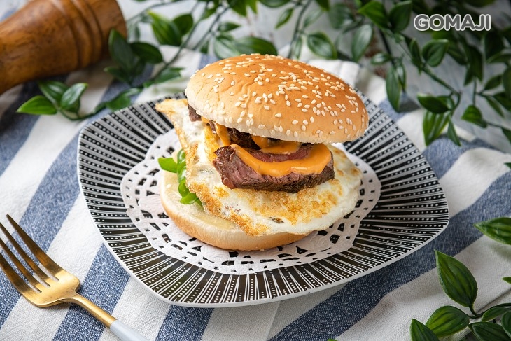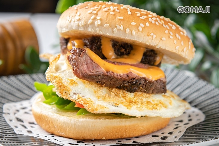 現點現煎的美式牛肉,鮮嫩多汁、肉質香軟,一刀切下滿滿肉汁溢出,相當誘人!與脆甜生菜、水煮蛋、起司層層交疊,咬下的瞬間,豐富餡料湧入雙頰,滿足的表情全寫在臉上!