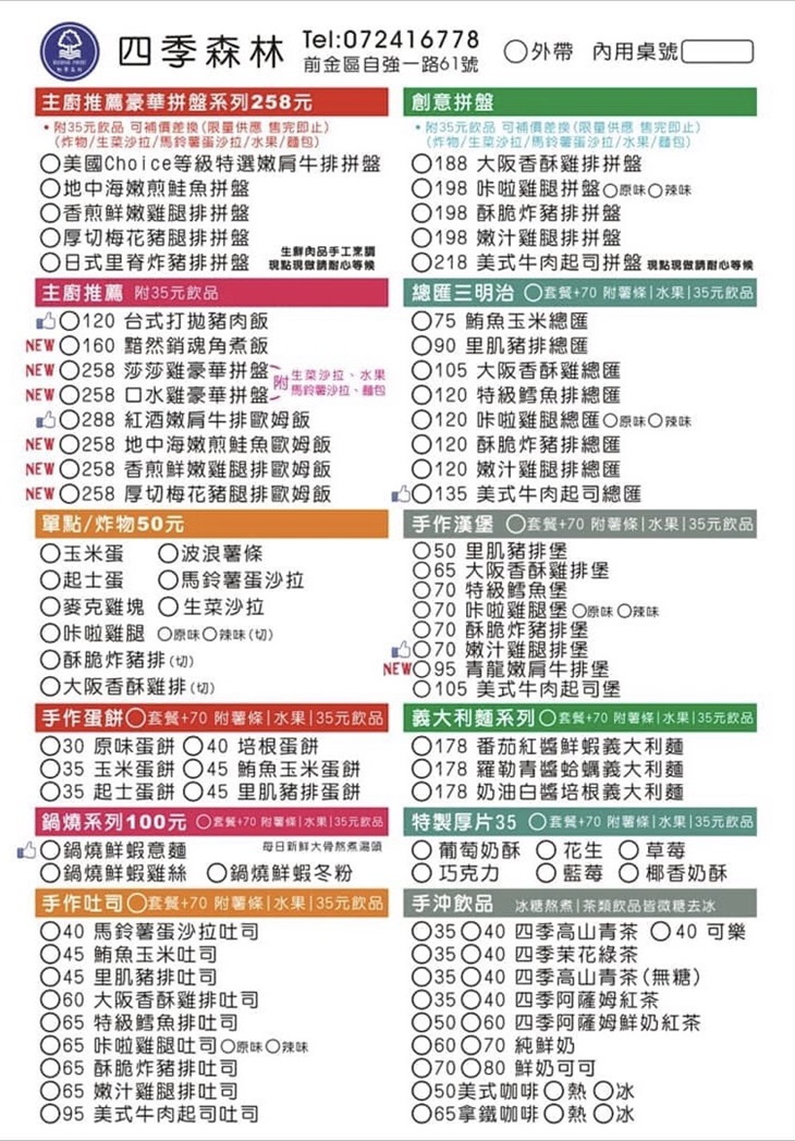 位於高雄市前金區自強一路上的「四季森林早午晚餐」,提供創意拼盤、總匯三明治、義大利麵等餐點品項,1樓是戶外用餐區,面向著公園,一邊看著散步的人們、一邊欣賞著草木的寧靜、一邊享用著美味餐點,更顯得悠閒愜意;2樓則是裝潢時尚的內用空間,舒適的冷氣房為您趕走酷熱的暑氣,從燈飾到桌椅材質更是經過用心挑選,店家也有提供兒童餐椅,讓帶小寶貝來用餐的您,能更安心的用餐喔!「四季森林早午晚餐」堅持選用新鮮食材製作,希望帶給顧客最純粹、健康無負擔的美味享受,快帶著親愛的家人好友來一趟早晨約會吧!