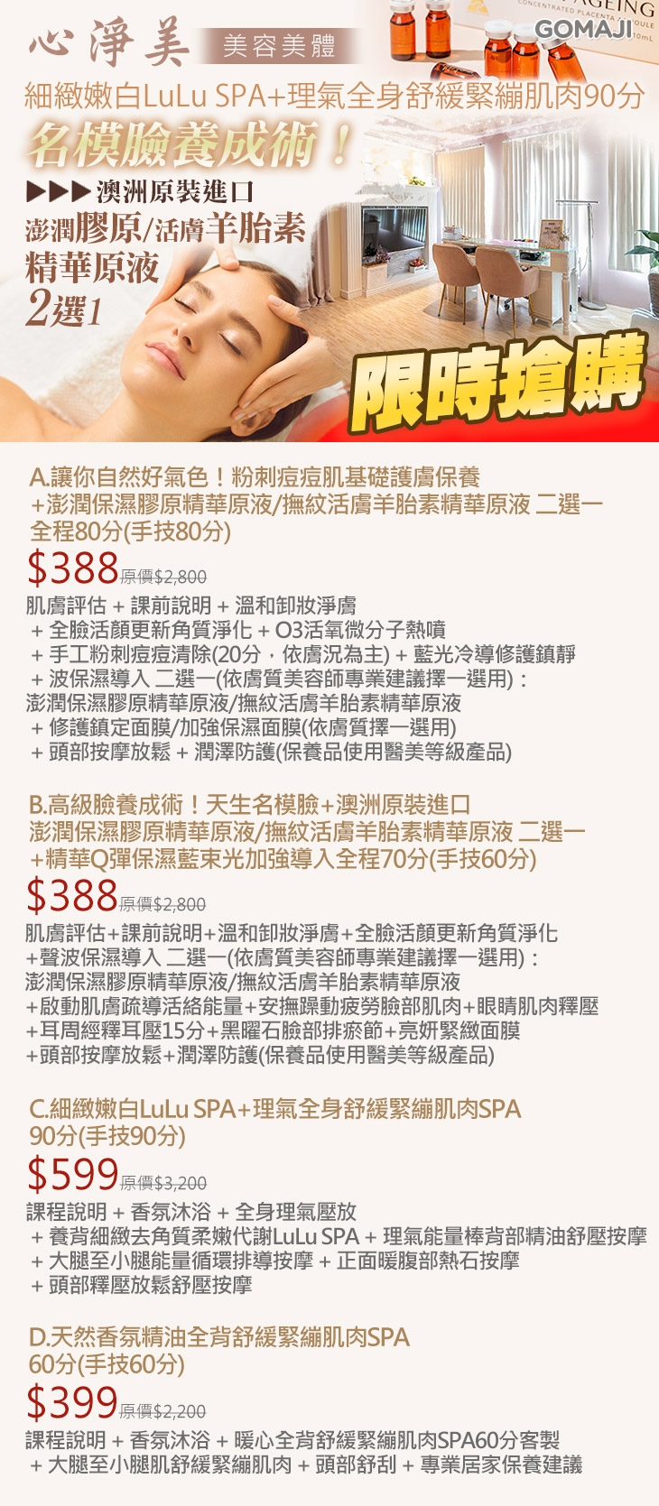 A.讓你自然好氣色!粉刺痘痘肌基礎護膚保養+澎潤保濕膠原精華原液/撫紋活膚羊胎素精華原液 二選一全程80分(手技80分) / B.高級臉養成術!天生名模臉+澳洲原裝進口澎潤保濕膠原精華原液/撫紋活膚羊胎素精華原液 二選一+精華Q彈保濕藍束光加強導入全程70分(手技60分) / C.細緻嫩白LuLu SPA+理氣全身舒緩緊繃肌肉SPA90分(手技90分) / D.天然香氛精油全背舒緩緊繃肌肉SPA60分(手技60分)