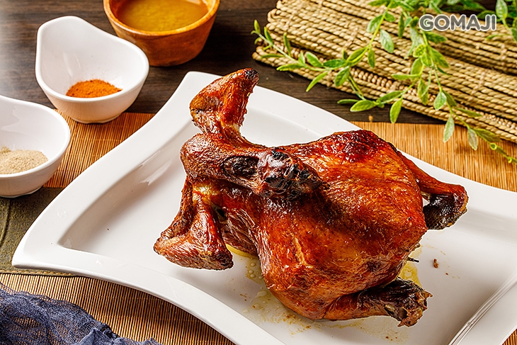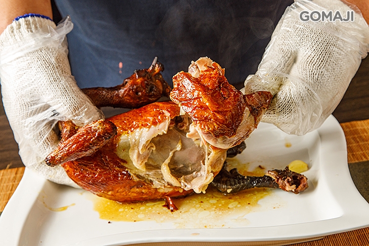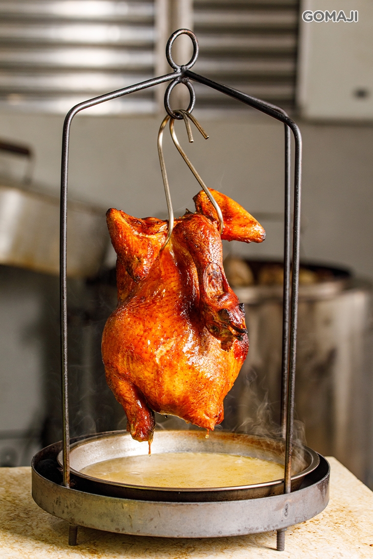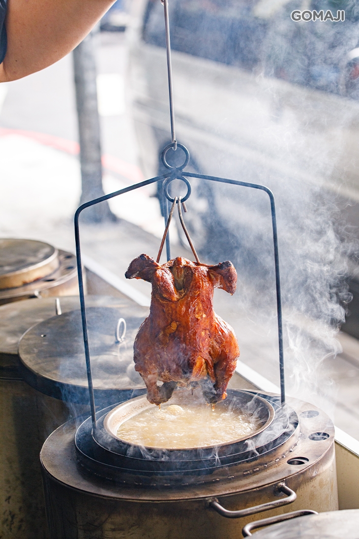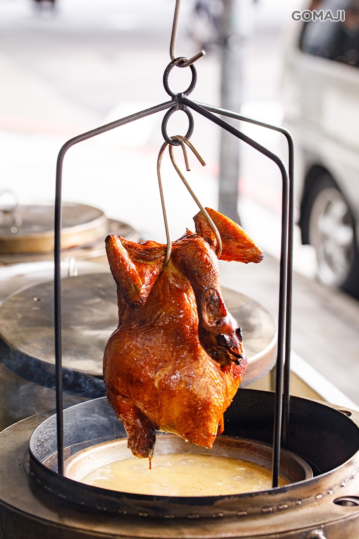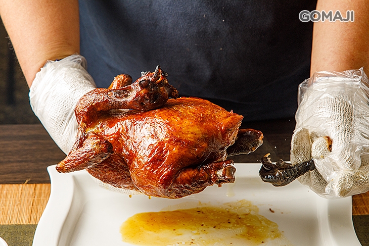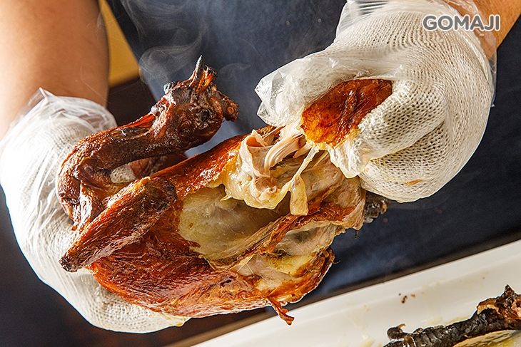 經過高溫烹製的雞肉,上桌後仍冒著熱騰騰的白煙,品嚐時可要小心燙口囉!帶焦糖色的外皮閃爍著油亮光澤,加上香噴噴的氣味讓人食指大動。酥脆口感帶一點汁液,滴滴皆精華所在,咬下鮮嫩多汁的肉質,滿滿的水分在口中四處噴發,實在是人生一大享受!