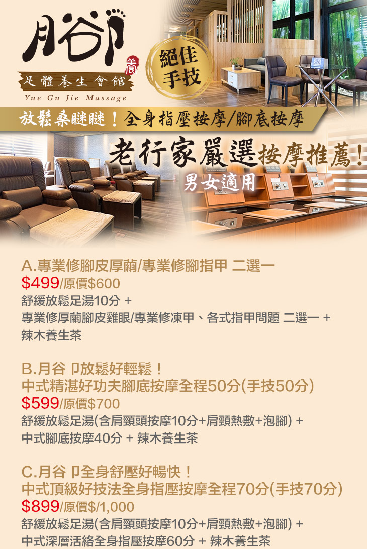 A.專業修腳皮厚繭/專業修腳指甲 二選一 / B.月谷卩放鬆好輕鬆!中式精湛好功夫腳底按摩全程50分(手技50分) / C.月谷卩全身舒壓好暢快!中式頂級好技法全身指壓按摩全程70分(手技70分)