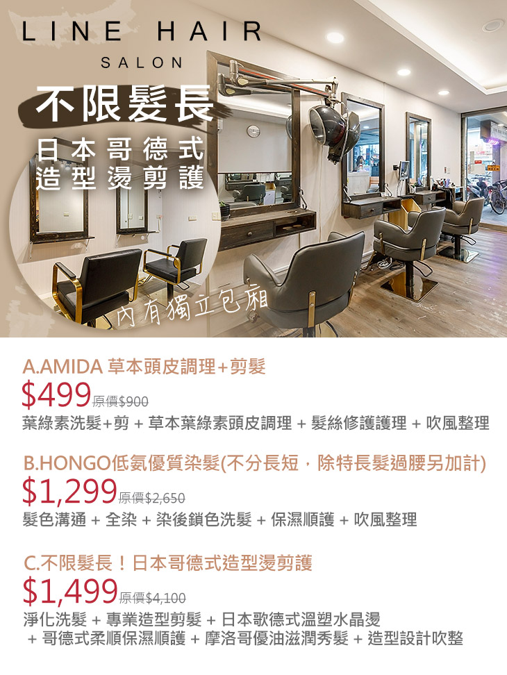 A.AMIDA 草本頭皮調理+剪髮 / B.HONGO低氨優質染髮(不分長短,除特長髮過腰另加計) / C.不限髮長!日本哥德式造型燙剪護