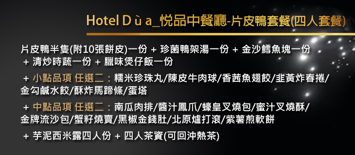➤ Hotel Dùa_悅品中餐廳:片皮鴨套餐(四人套餐)