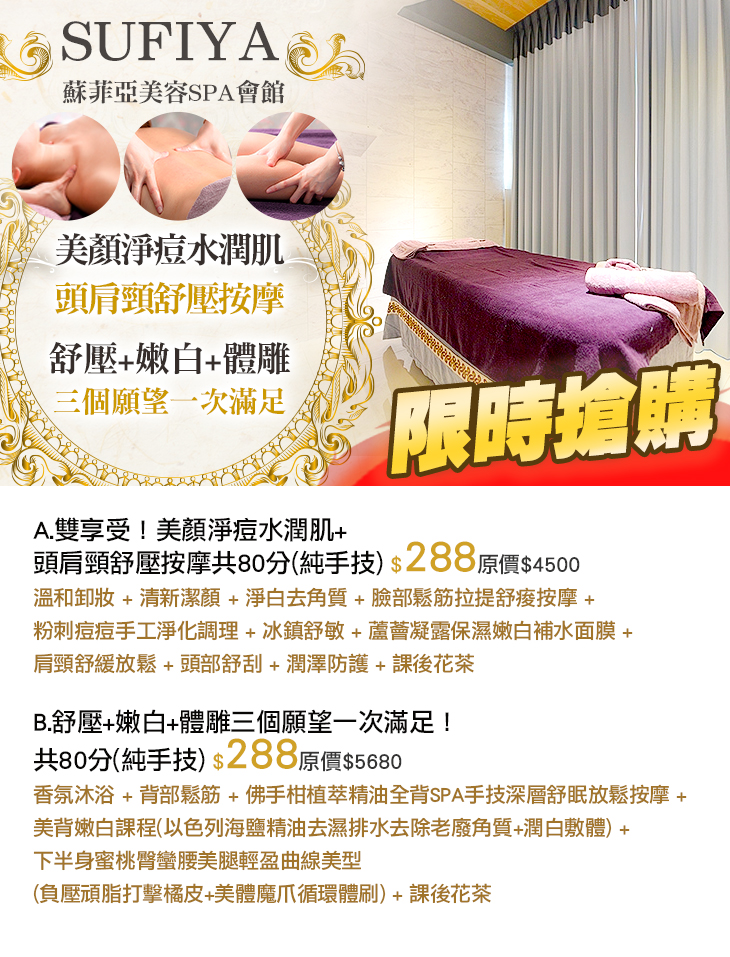 【SUFIYA蘇菲亞美容SPA會館】感謝麻吉們熱烈搶購,已全數賣光光。