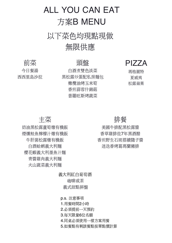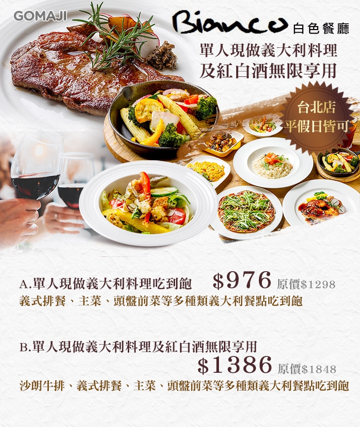 ✿B.單人現做義大利料理及紅白酒無限享用