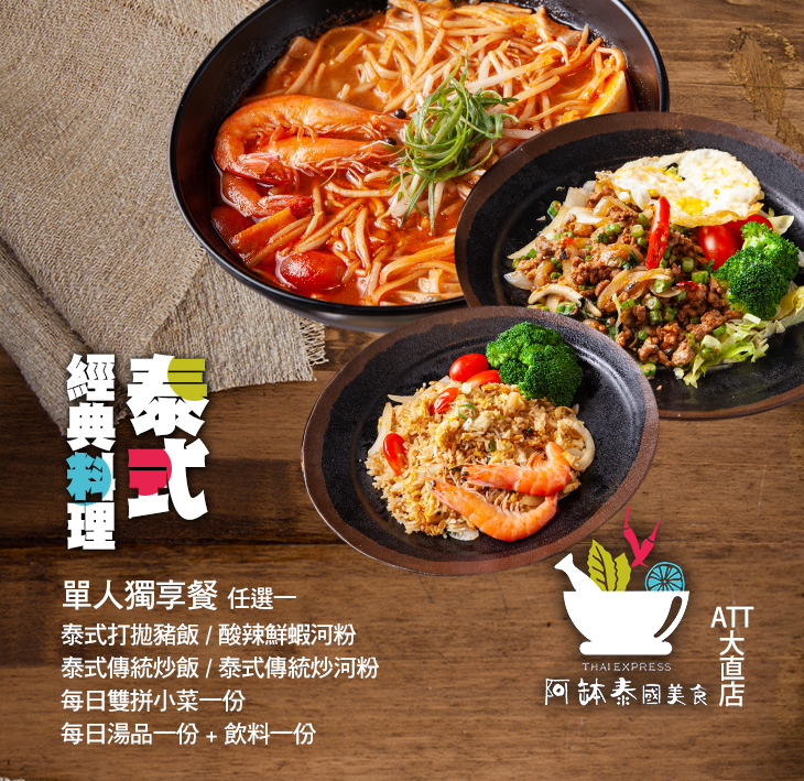 撒哇底咖!位於ATT大直店2樓的「阿缽泰國美食」,結合經典與人氣的平價泰式料理,竟然在ATT就吃的到!嚴選新鮮食材與特製香料,透過泰籍主廚精湛的手藝,以高貴不貴的精神,為您獻上一道道泰國必吃的國民美食,絕對符合台灣人的口味與期待,不論是大人小孩都會喜歡!本次與GOMAJI聯合推出超值單人獨享餐,讓您不必遠赴泰國,就能一起品嚐最在地的風味囉!