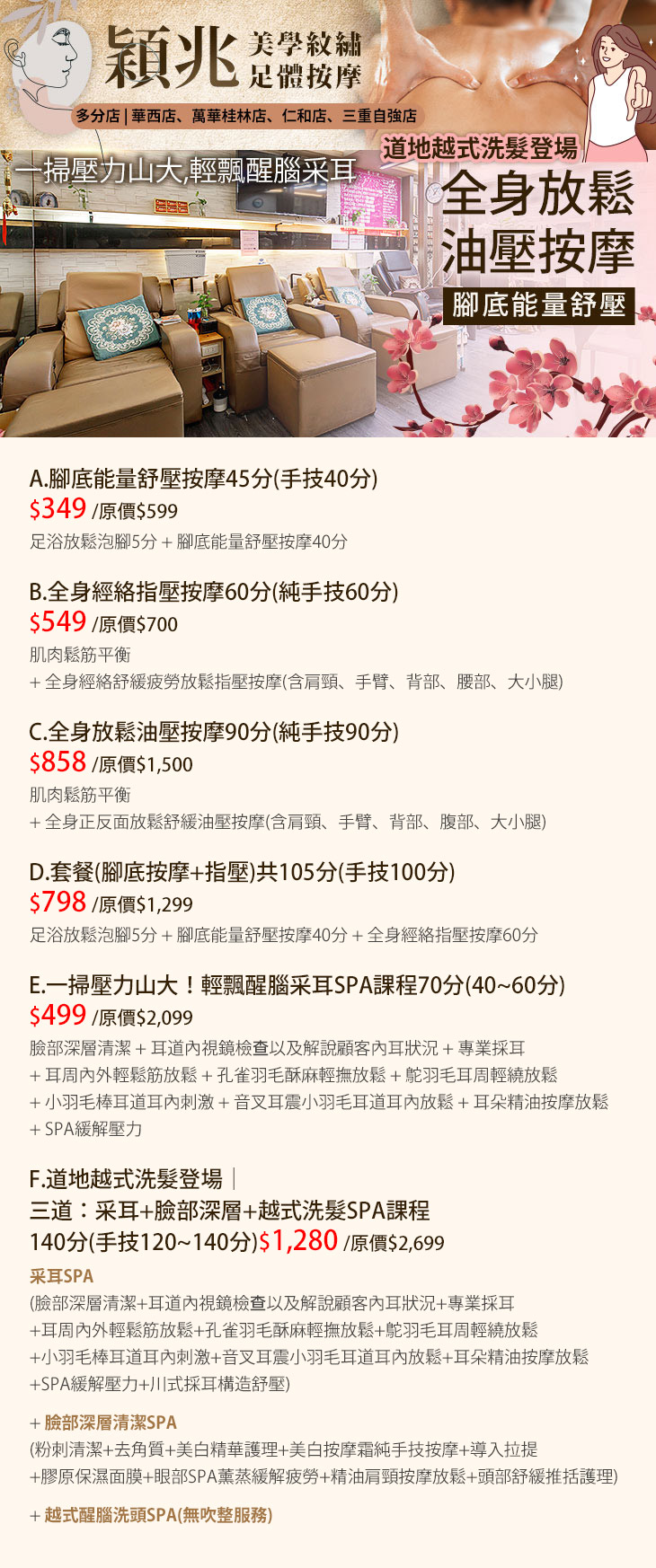 A.腳底能量舒壓按摩45分(手技40分) / B.全身經絡指壓按摩60分(純手技60分) / C.全身放鬆油壓按摩90分(純手技90分) / D.套餐(腳底按摩+指壓)共105分(手技100分) / E.一掃壓力山大!輕飄醒腦采耳SPA課程70分(40~60分) / F.道地越式洗髮登場|三道:采耳+臉部深層+越式洗髮SPA課程140分(手技120~140分)