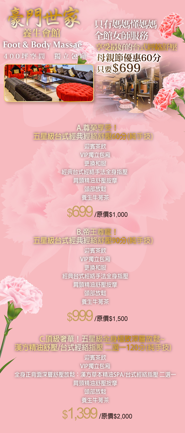 【豪門世家養生會館】採用經典不敗的台式按摩,搭配頂級的芬芳精油,不僅能舒緩痠脹不適的肌肉,還能放鬆您緊繃的身心靈狀態,提供最極致的享受。