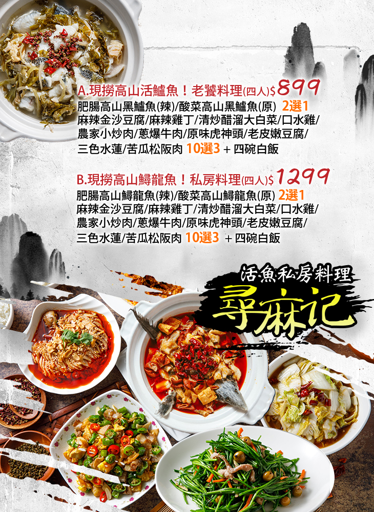肥腸高山鱘龍魚(辣)/酸菜高山鱘龍魚(原) 2選1 + 麻辣金沙豆腐/麻辣雞丁/清炒醋溜大白菜/口水雞/農家小炒肉/蔥爆牛肉/原味虎神頭/老皮嫩豆腐/三色水蓮/苦瓜松阪肉 10選3 + 白飯四碗