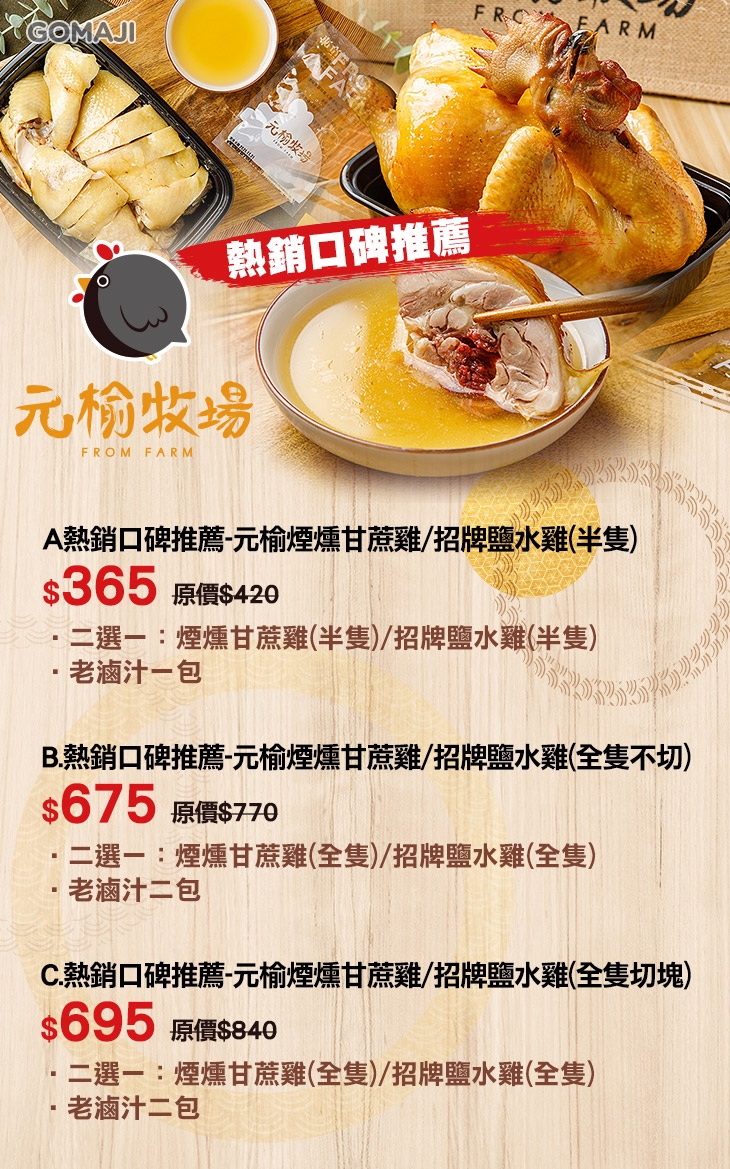 無論是招牌鹽水雞,還是煙燻甘蔗雞,雞種源頭把關,搭配獨門烹調方式,讓雞肉的口感與美味,更上一層,皮Q彈牙,不油不膩,清爽美味,肉嫩多汁又鮮美,本次更與GOMAJI聯合推出超值獨享優惠,推出高CP值組合,讓您不用花太昂貴的錢,也能享受到超優質的味蕾饗宴!送禮自用兩相宜,推薦給您!