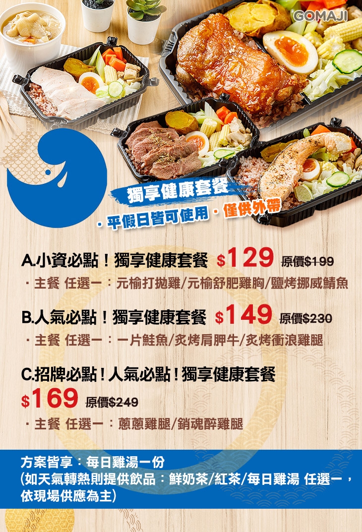 〈主餐:元榆打拋雞/元榆舒肥雞胸/鹽烤挪威鯖魚 任選一 + 每日雞湯一份(如天氣轉熱則提供飲品:鮮奶茶/紅茶/每日雞湯 任選一,依現場供應為主)〉