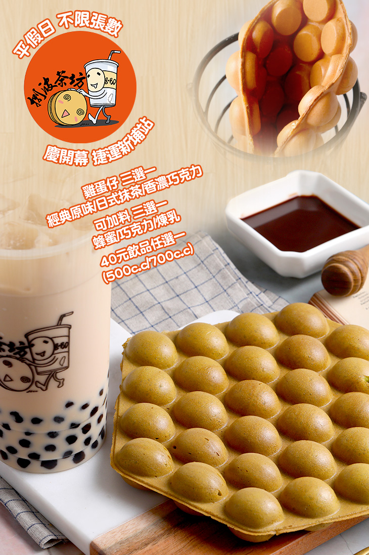 〈雞蛋仔:經典原味/日式抹茶/香濃巧克力 三選一 + 可加料:蜂蜜/巧克力/煉乳 三選一 + 40元飲品任選一(500c.c/700c.c)〉