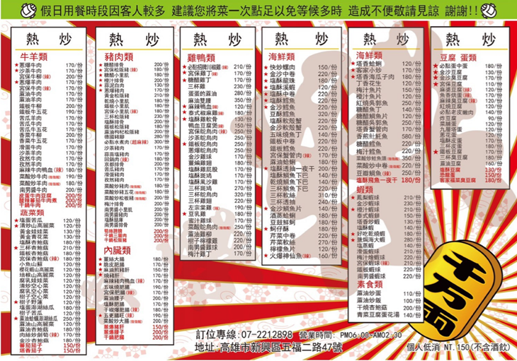 餐點提供以料好味佳、噴香迷人的熱炒、燒烤串燒為主,品項豐富、選擇多元!烤的、煮的、炒的、炸的....,不同食材、不同烹飪方式,再經過主廚的精湛手藝巧手變化之後,讓道道平凡菜色也能瞬間化身為非凡料理喔 ~
