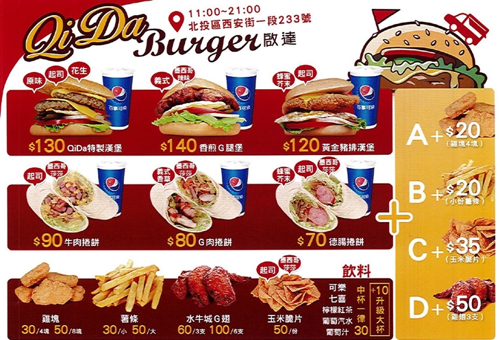 “吃得飽,才叫堡!”──在北投明德捷運站附近,紅白條紋搭上手繪漢堡的招牌,QiDa漢堡巧而溫馨的模樣,彷彿美國電影裡會出現的漢堡快餐車一般,十分惹人注目,店內餐點同樣講求美式的超大份量,提供料多實在的各式漢堡、捲餅,每一樣都是現點現做的美味,不只要您吃得飽,還要吃得美味又滿足!無論是睡到正午的假日,亦或是平日下班放課後,都不妨來QiDa漢堡享受一份飽足可口的餐餚,在逐漸填飽肚子的同時,也從美食中得到療癒,體會何謂身與心的富足。