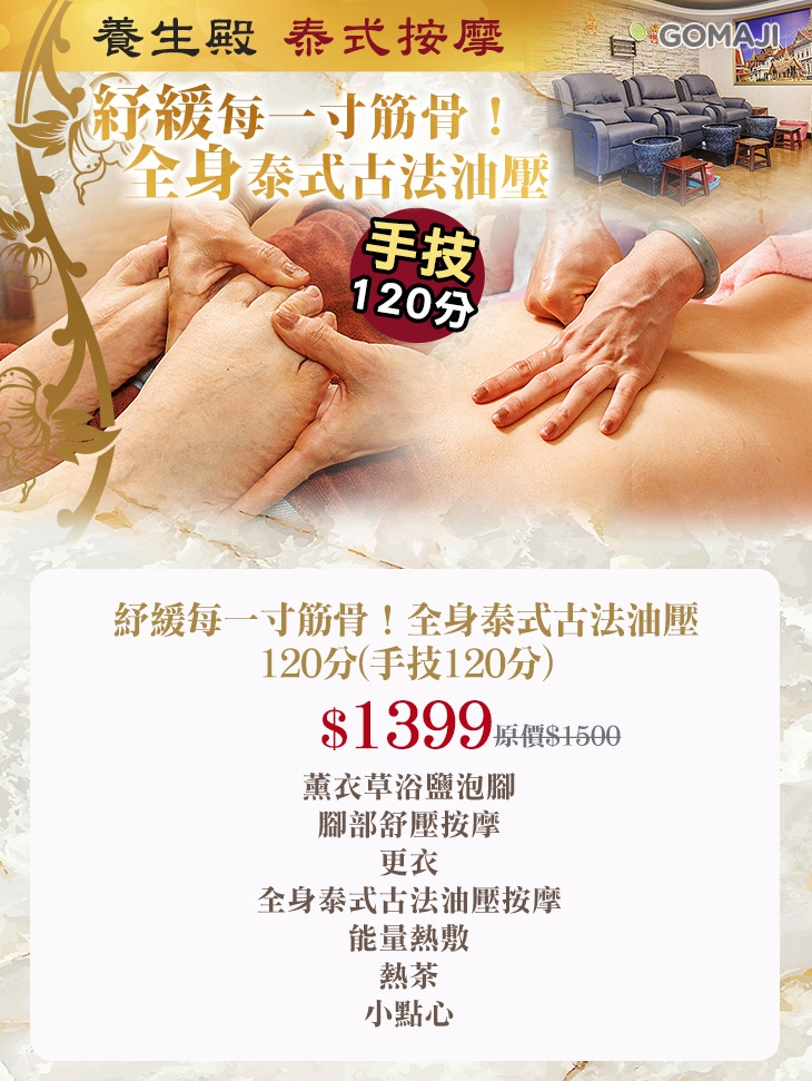紓緩每一寸筋骨!全身泰式古法油壓120分(手技120分)