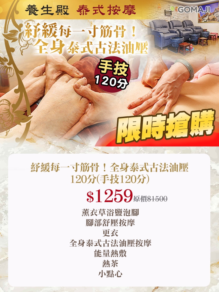 紓緩每一寸筋骨!全身泰式古法油壓120分(手技120分)