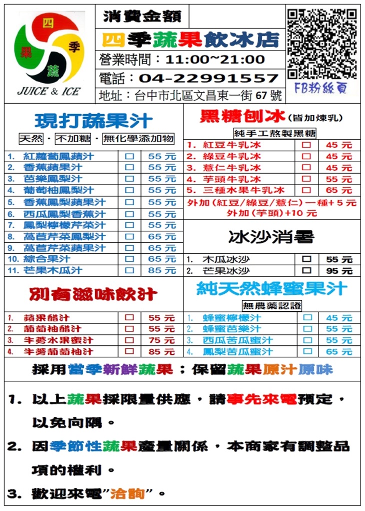 精選GOOGLE評價5顆星店家!位於台中市北區文昌東一街67號上的【四季蔬果飲冰店】,嚴選台灣自產自種優質品種水果,依客人喜好加冰,堅持不過多調味,天然、不加糖、無人工添加物,讓果汁自然散發水果美味,新鮮、好喝!來店品嚐過的顧客都這麼說!無論四季,來杯色彩鮮豔、繽紛;健康、營養的現打蔬果汁,保證讓您身心透心涼、心情快樂一百分!