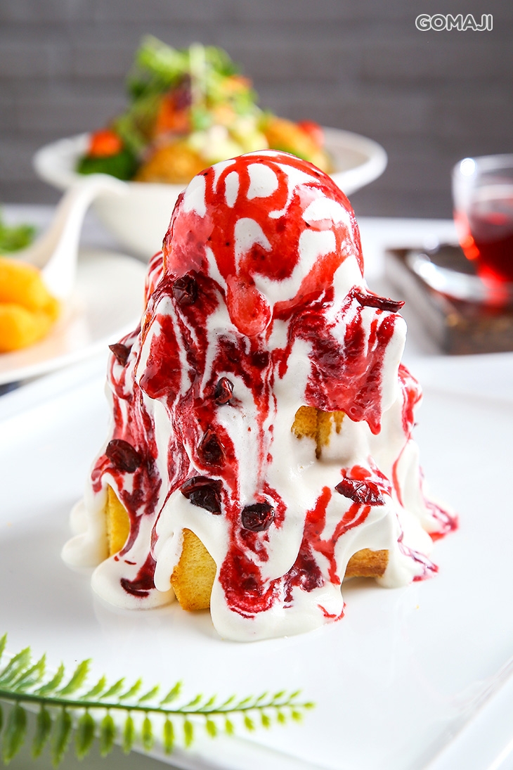 天啊!這道甜品絕對會是女孩們的最愛!美麗迷人的模樣,帶有雲朵般輕柔的口感,以法式金磚麵包為基底,淋上鮮奶油、野莓醬,再以果乾點綴其中,彷彿一座玫瑰盛開的冰山,魔幻迷人、令人難以置信!入口細嚐,舌尖飄散著香甜的香氣,透過主廚靈巧的雙手,讓甜點搖身一變成為盤上魅力無敵的焦點,為您的用餐體驗增添更多色彩與難忘回憶!