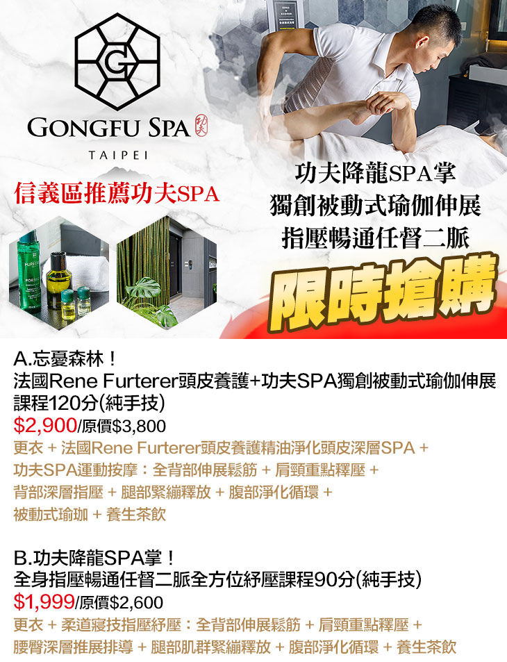 A.忘憂森林!法國Rene Furterer頭皮養護+功夫SPA獨創被動式瑜伽伸展課程120分(純手技) / B.功夫降龍SPA掌!全身指壓暢通任督二脈全方位紓壓課程90分(純手技)