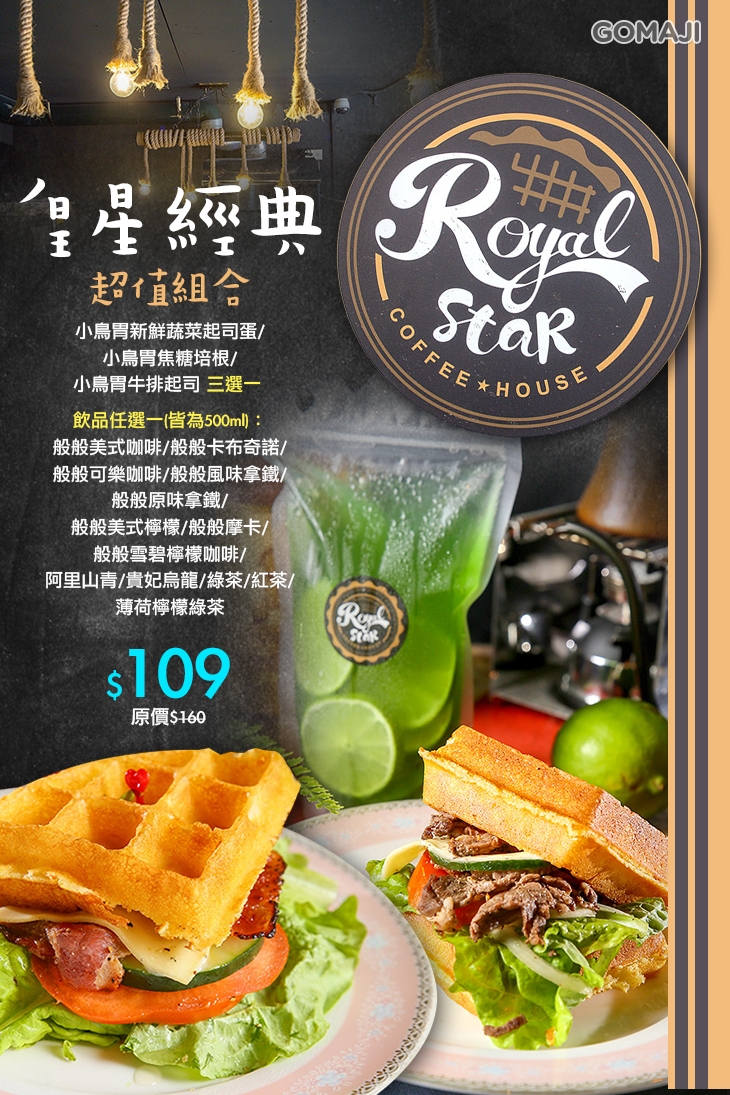 每天忙碌的上班生活枯燥乏味,總是需要來一點美食療癒身心靈。位於八德路二段巷弄內的【皇星咖啡屋】,專營精緻美味的鬆餅三明治及現煮手沖咖啡,無論是早餐、午餐或是下午茶,都能享用到香、醇、濃的咖啡與現烤鬆餅的美妙滋味,暗色系與木質跳色的質感裝潢,給您宛如皇室般的尊榮及享受。快跟著GOMAJI腳步,一同來品嘗風味非凡的皇星經典超值組合吧!