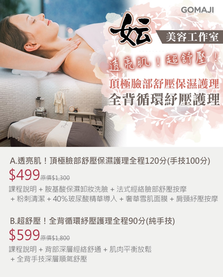 每天坐辦公室,導致您的背部僵硬、痠痛不已嗎?專業美容師一流的手技,可強可弱的力道,搭配對於人體脈絡的專業知識,為您深層舒壓,幫助舒通背部經絡,柔軟緊繃的筋肉,緩解連日累積的痠脹不適,讓您重拾舒活的身心!