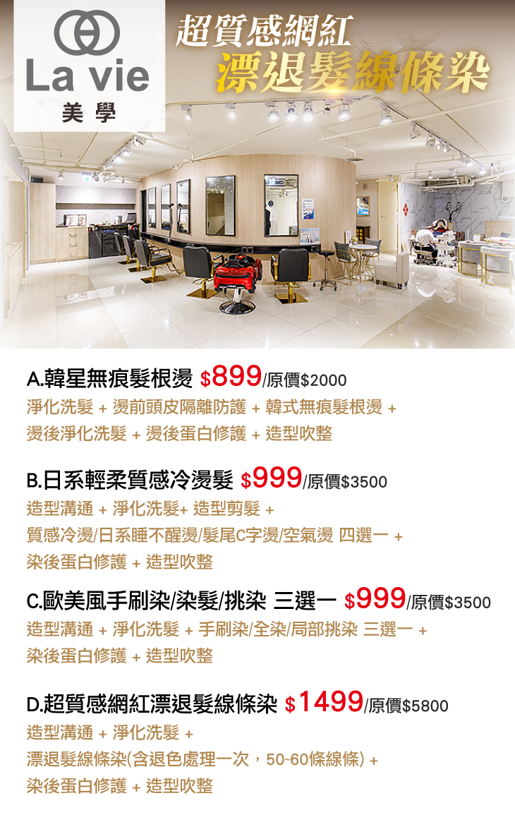 〈造型溝通 + 淨化洗髮 + 漂退髮線條染(含退色處理一次,50~60條線條) + 染後蛋白修護 + 造型吹整〉