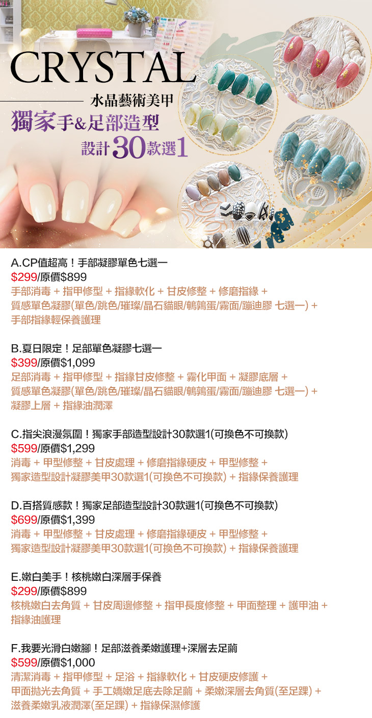 A.CP值超高!手部凝膠單色七選一 / B.夏日限定!足部單色凝膠七選一 / C.指尖浪漫氛圍!獨家手部造型設計30款選1(可換色不可換款) / D.百搭質感款!獨家足部造型設計30款選1(可換色不可換款) / E.嫩白美手!核桃嫩白深層手保養 / F.我要光滑白嫩腳!足部滋養柔嫩護理+深層去足繭
