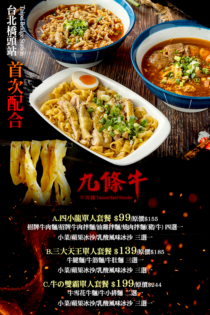 早是最能代表台灣的國民美食,來自各國的老饕到台灣必定嚐上一碗,九條牛創辦人,在多年餐飲美食開發的先機下,吃遍了牛的各個部位,並從中尋求最適合的口感,經過不斷嘗試、研發,最後成功地調整出最香醇、最濃郁的紅燒湯頭,且一碗美味的牛肉麵,除了牛肉烹煮得軟嫩適中又入味、麵條Q彈不軟爛之外,最後當然不能錯過翠綠青蔥的點綴,特別選用台灣自產自種 - 宜蘭最美味的三星蔥來烘托出香氣,再搭配四種各有擁護者的麵條,帶給顧客多重牛肉麵的味蕾口感!