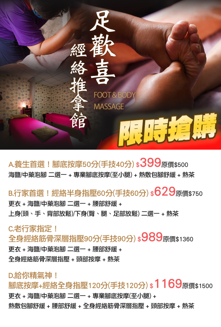A.養生首選!腳底按摩50分(手技40分) / B.行家首選!經絡半身指壓60分(手技60分) / C.老行家指定!全身經絡筋骨深層指壓90分(手技90分) / D.給你精氣神!腳底按摩+經絡全身指壓120分(手技120分)