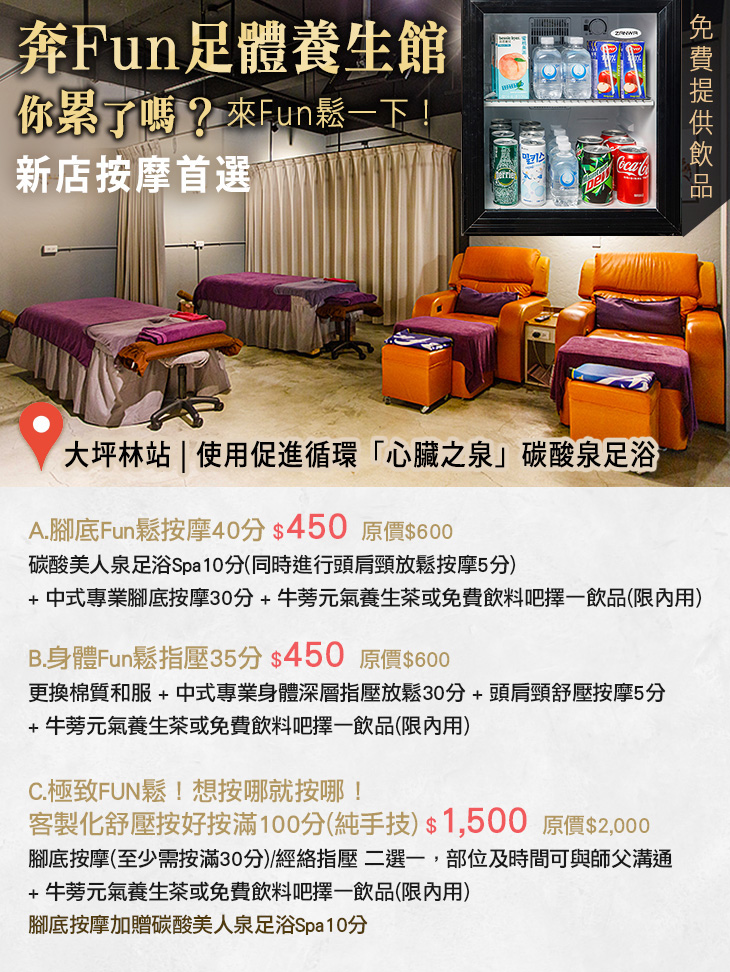 A.腳底Fun鬆按摩40分 / B.身體Fun鬆指壓35分 / C.極致FUN鬆!想按哪就按哪!客製化舒壓按好按滿100分(純手技)