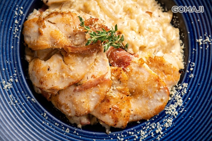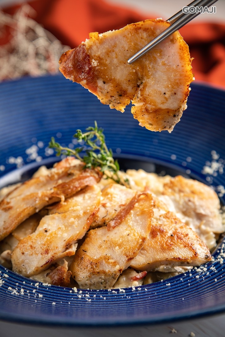 濃郁綿稠的香濃白醬,迷人奶香味勾勒出嫩雞的鮮甜,軟嫩噴汁、鮮美不已,在口中交織出驚艷美味,入口帶點火腿香氣與乳酪濃香,豐富層次令人一嚐就愛上。