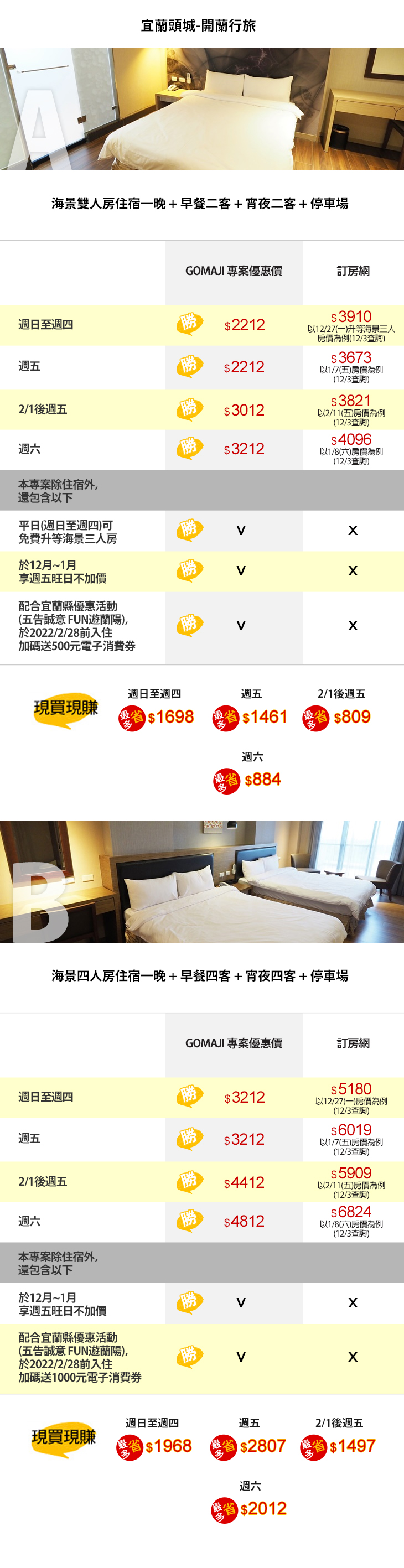 ★ A方案平日(週日至週四)可免費升等海景三人房!