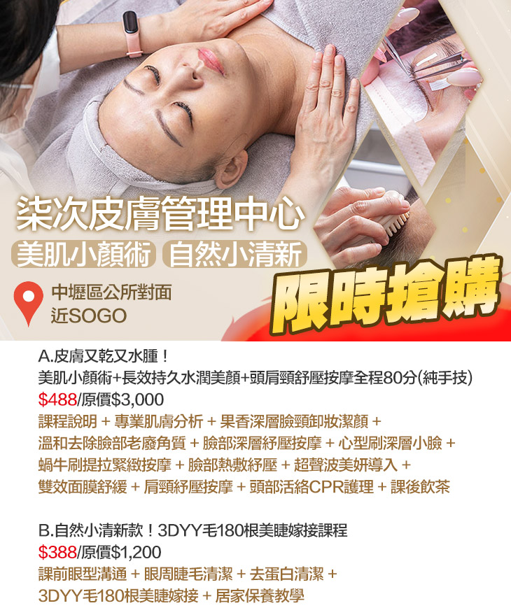 A.皮膚又乾又水腫!美肌小顏術+長效持久水潤美顏+頭肩頸舒壓按摩全程80分(純手技) / B.自然小清新款!3DYY毛180根美睫嫁接課程