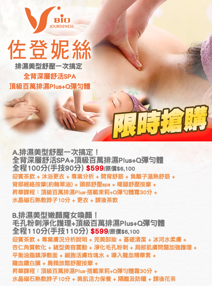 A.排濕美型舒壓一次搞定!全背深層舒活SPA+頂級百萬排濕Plus+Q彈勻體全程100分(手技90分) / B.排濕美型嫩顏魔女喚顏!毛孔粉刺淨化護理+頂級百萬排濕Plus+Q彈勻體全程110分(手技110分)