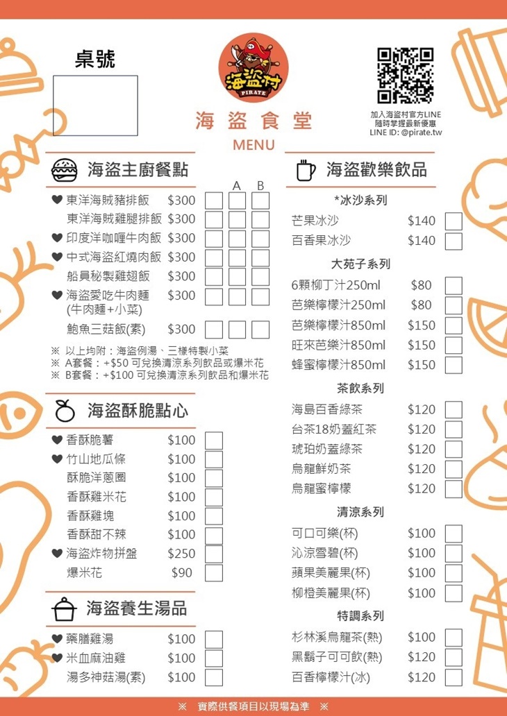 樂園暢玩後,餓了嗎?快到海盜食堂看看吧!採用新鮮食材,結合大廚巧思精心烹調的可口料理,不僅鮮味及溫度兼具,更在味覺五味之上發揮出極致創意!除了有各項炸物小點外,主餐的東洋海賊雞腿排飯、海盜愛吃牛肉麵、船員秘製雞翅飯等等,都是人氣明星餐點喔!一道道料理都充滿驚喜,令人流連忘返,讓你吃完還想一嚐再嚐!
