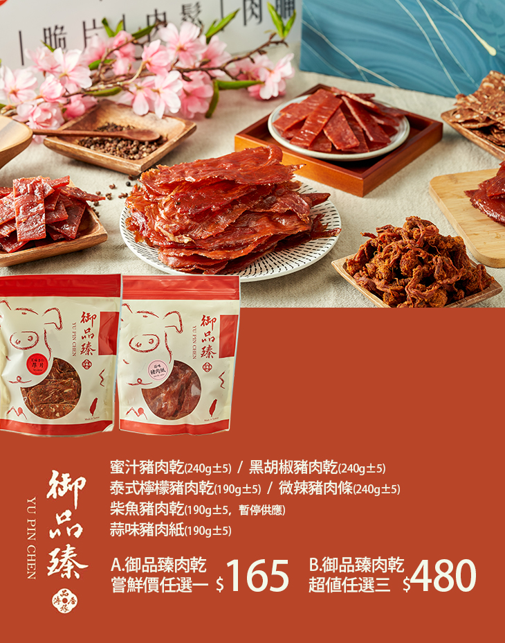 〈蜜汁豬肉乾(240g±5)/黑胡椒豬肉乾(240g±5)/泰式檸檬豬肉乾(190g±5)/微辣豬肉條(240g±5)/柴魚豬肉乾(190g±5)/蒜味豬肉紙(190g±5) 任選三〉