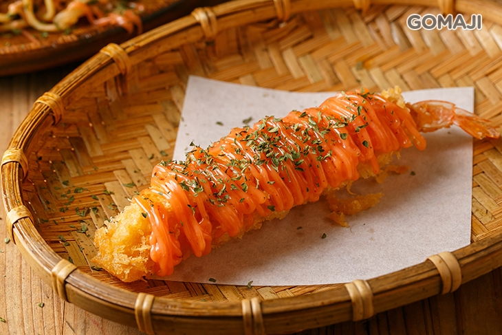 肉質飽滿彈牙的新鮮蝦子,一整隻豪爽地放入油鍋酥炸,爽脆的外皮內還保留著鮮蝦的甜美,淋上滿滿的特製紅醬一同品嚐,香濃又不膩口的美好滋味,讓人愛不釋口。