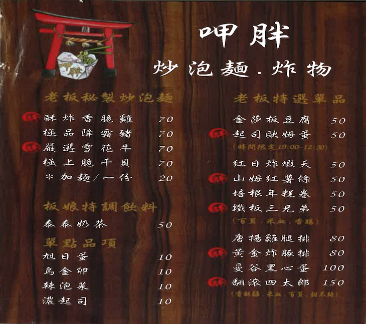 位於巷子內的呷胖.炒泡麵.炸物,是名符其實的巷弄美食,風雅別緻的店外裝潢,彷彿日本古裝劇中常見的小茶舖,獨特的氛圍令人忍不住駐步,想上前一探究竟,步入店內後,裡頭的裝飾擺設更是不亞於店門,充滿巧思的日式裝修,都是老闆親自設計,長廊型的用餐區旁,擺著寫滿客人好評的繪馬,美味口碑有保證!