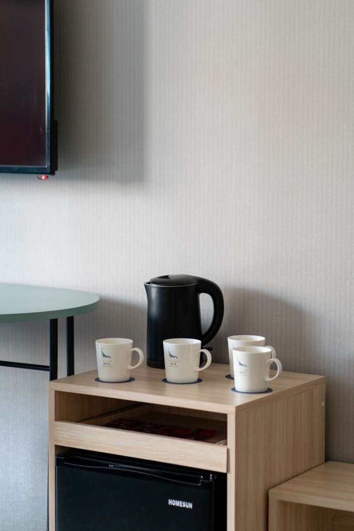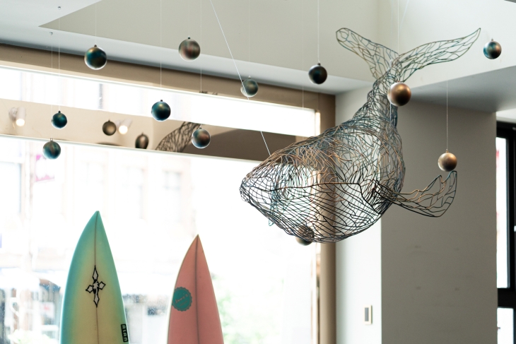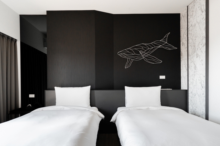 整體環境裝潢,清新簡約時尚,大廳前方高掛於天花板上的鯨魚造型裝飾,完整凸顯鄰近頭城靠海的象徵!希望每一位來此旅行、放鬆的麻吉,能像鯨魚一樣,因為渴望自由、渴望解放,從忙碌的生活中,找回迷失的方向。
