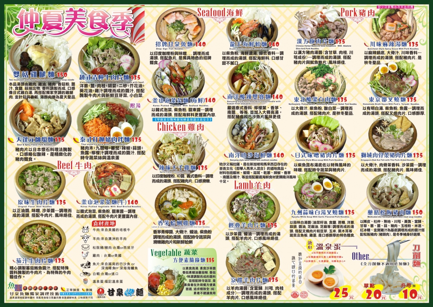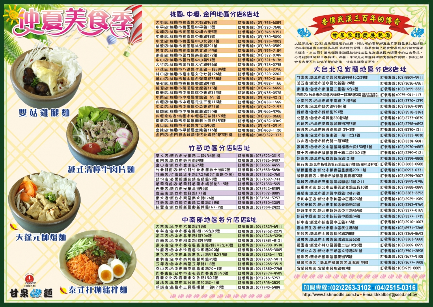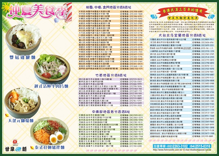 20年老招牌甘泉魚麵,北部首波合作!由2間分店聯手合作!大陸湖北省(武漢)是魚麵發展的故鄉,可說是香傳武漢三百年的傳奇!湖北省的雲夢縣更是眾家魚麵發展的起始店,近年來隨著需求的提升與經濟環境的變遷,雲夢魚麵已逐步發展成為行銷全國著名麵食。「甘泉魚麵」引進魚麵製作調理技術後,為符合台灣人的口味需求,憑藉調理師對日本料理、西餐、東南亞及中式料理的實務操作經驗,調配出融合各大餐系的口味精華之作,這也是甘泉魚麵創立長久仍在餐飲界屹立不搖的原因之一。